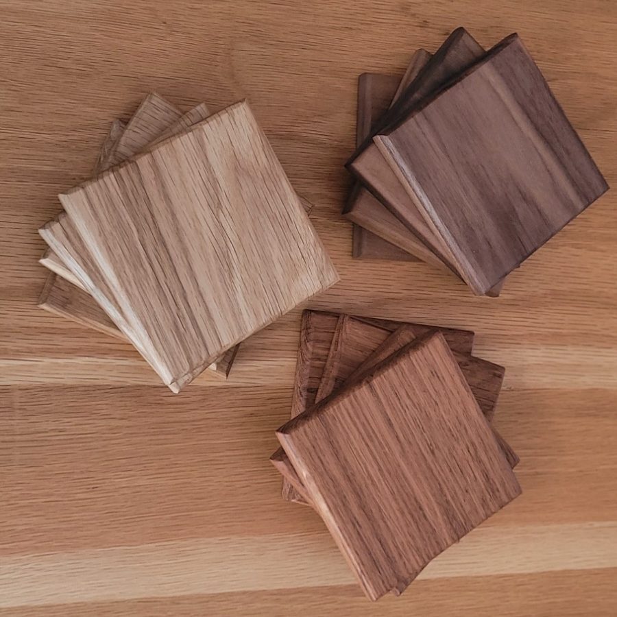 Set of 4, 8 or 12 coasters, made from Brown Oak, English Oak and Walnut.